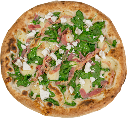siekany czosnek, liście szpinaki, mozarella ,pancetta, kozi ser