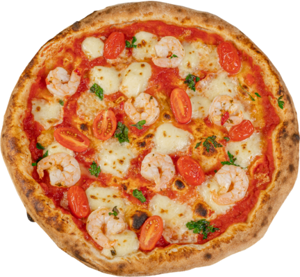 pesto bazyliowe, mozarella, krewetki, pomidory koktailowe, świeża bazylia