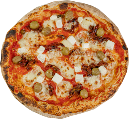 sos pomidorowy, mozarella, suszone pomidory, oliwki, feta