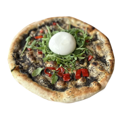 pasta z czarnych trufli, burrata, rukola, papryczki